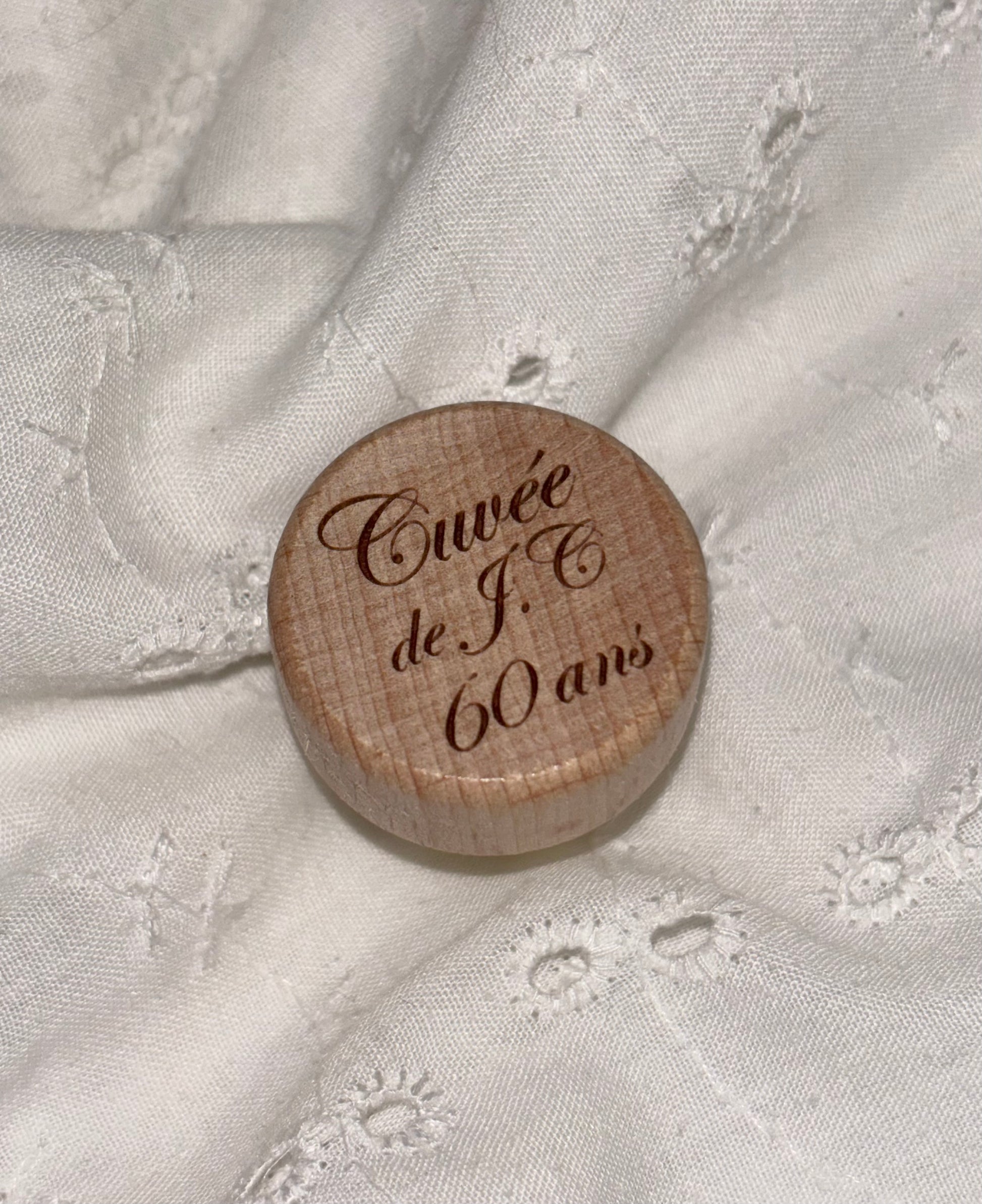 Personnalisez votre bouchon de bouteille en bois avec l'inscription de votre choix : prénom, date, logo ou message ..